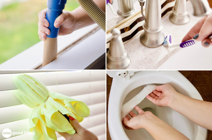 To hit these areas, take a broom or mop and tie a microfibre cloth to the end with a rubber band. Congratulations, you’ve just made a pro-level cleaning tool in under 30 seconds.